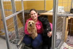 Suvi Mantila esittelee koirahoitolaansa yhdessä Oton ja Sissin kanssa.